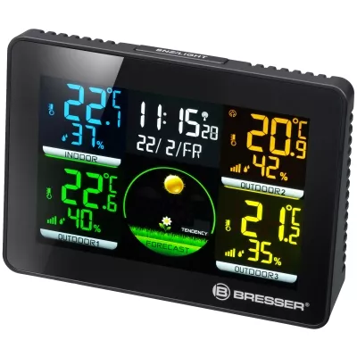 Das neue BRESSER Thermo Hygro Quadro NLX bietet wie unser Temeo Hygro Quadro (Art.-Nr.: 7000020000000) die Möglichkeit an 4 unterschiedlichen Messpunkten gleichzeitig die Temperatur und Luftfeuchtigkeit zu messen. Zusätzlich wird bei diesem Gerät auch der Wettertrend, sowie Uhrzeit und Datum auf dem übersichtlich gestalteten Farbdisplay angezeigt.