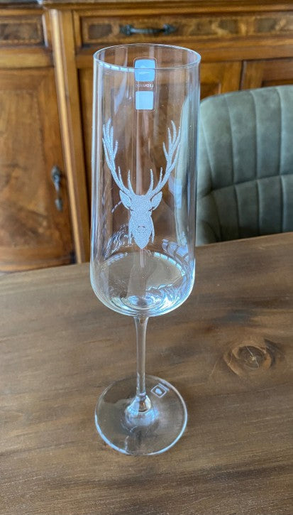 Wir bieten Sektglas mit einen Hirschkopf versehen an.